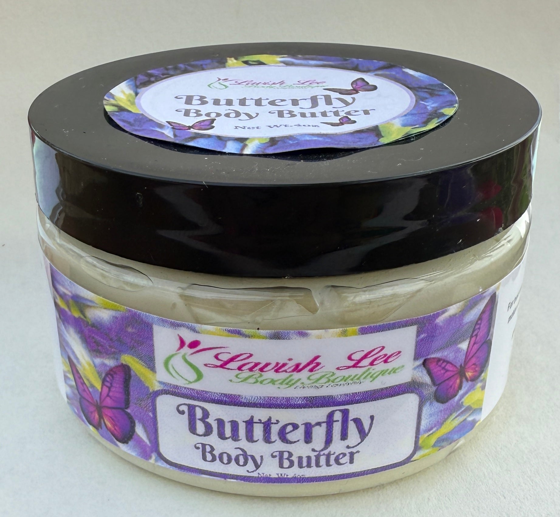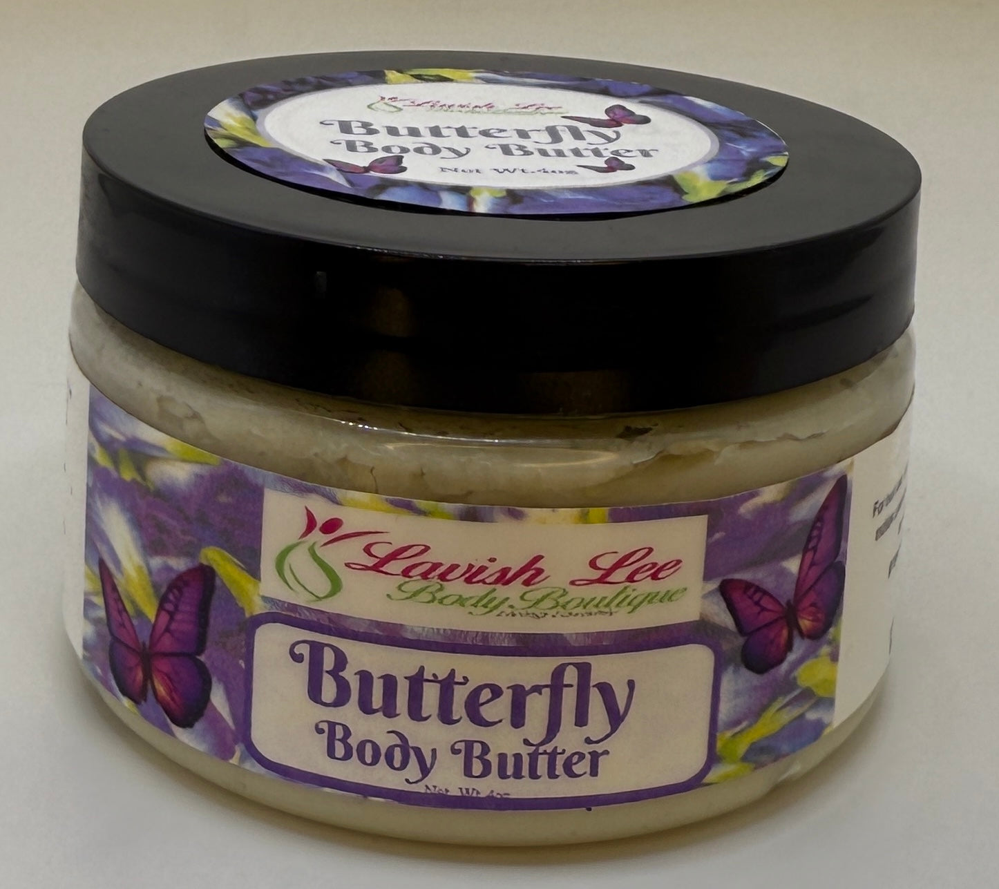 Indulge in the decadent scent of Butterfly Body Butter. Made with high-quality ingredients, like butterfly pea flower, this luxurious body butter will leave your skin feeling nourished and smelling delicious. Perfect for daily use and as a treat for your senses. Ingredients: Shea Butter, Coconut oil, Grape seed oil, Essential oil blend, Colorant, Beeswax, Avocado oil, and butterfly pea flower.